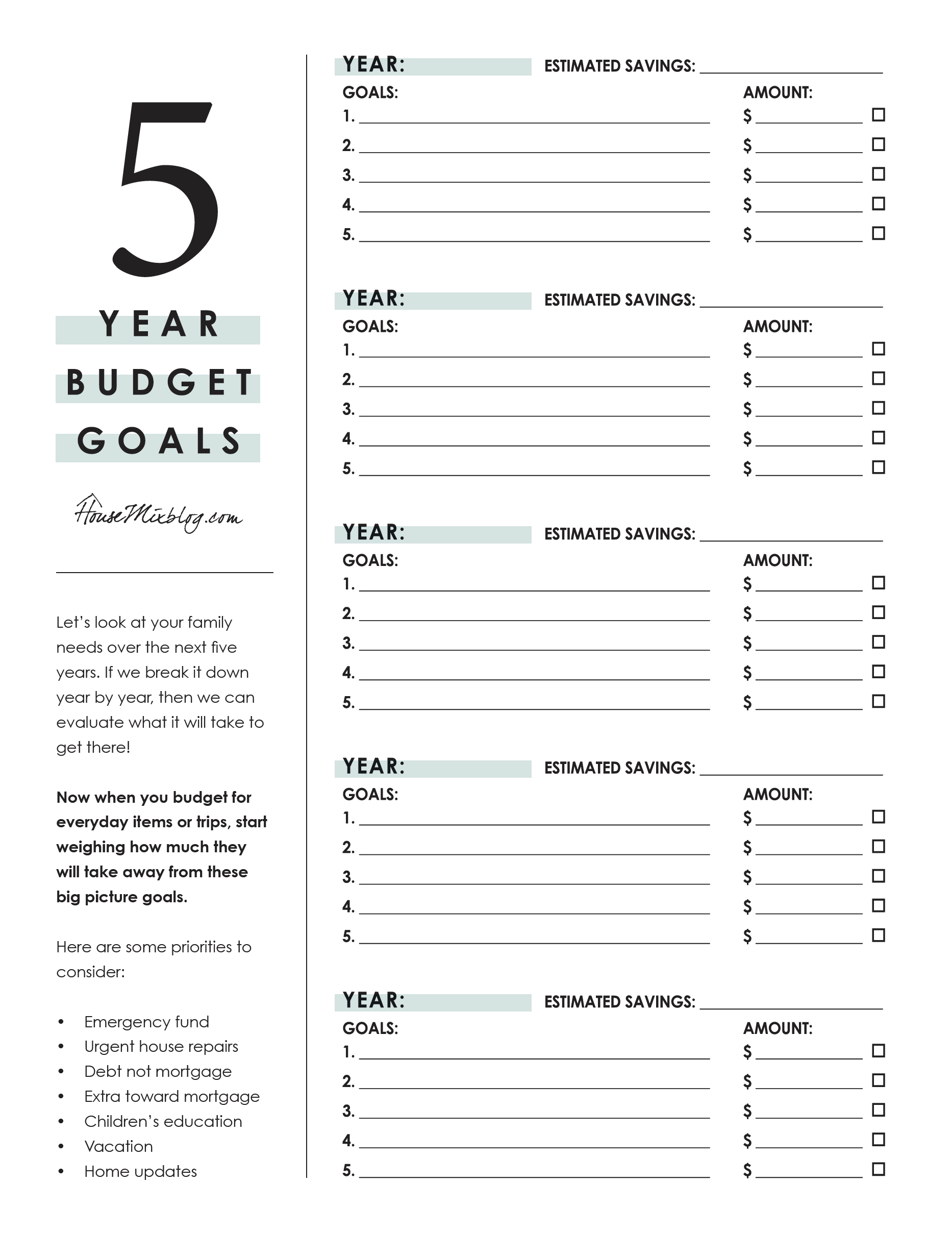5 Year Budget Plan Printable House Mix