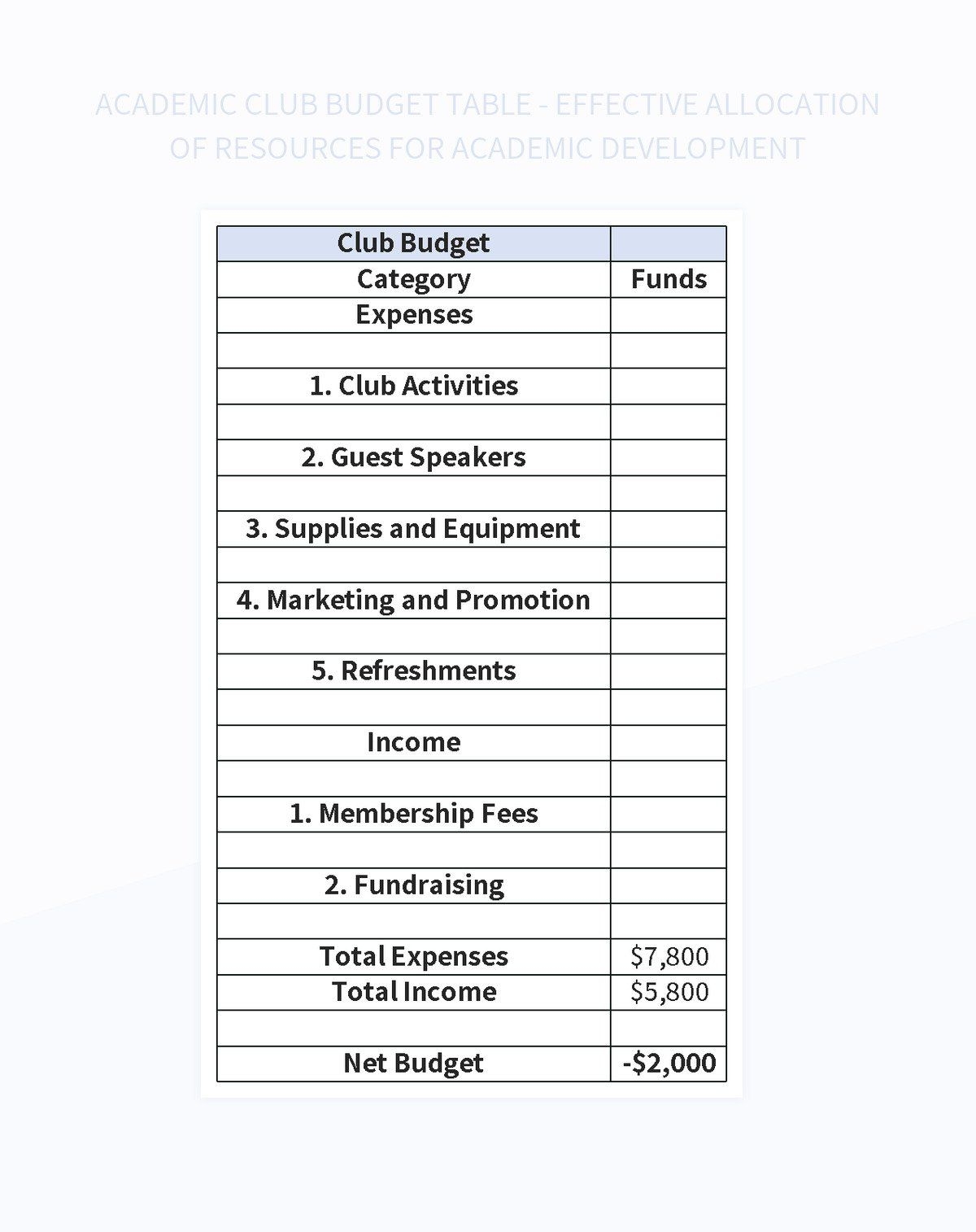 Academic Club Budget Table Effective Allocation Of Resources For Academic Development Excel Template And Google Sheets File For Free Download Slidesdocs