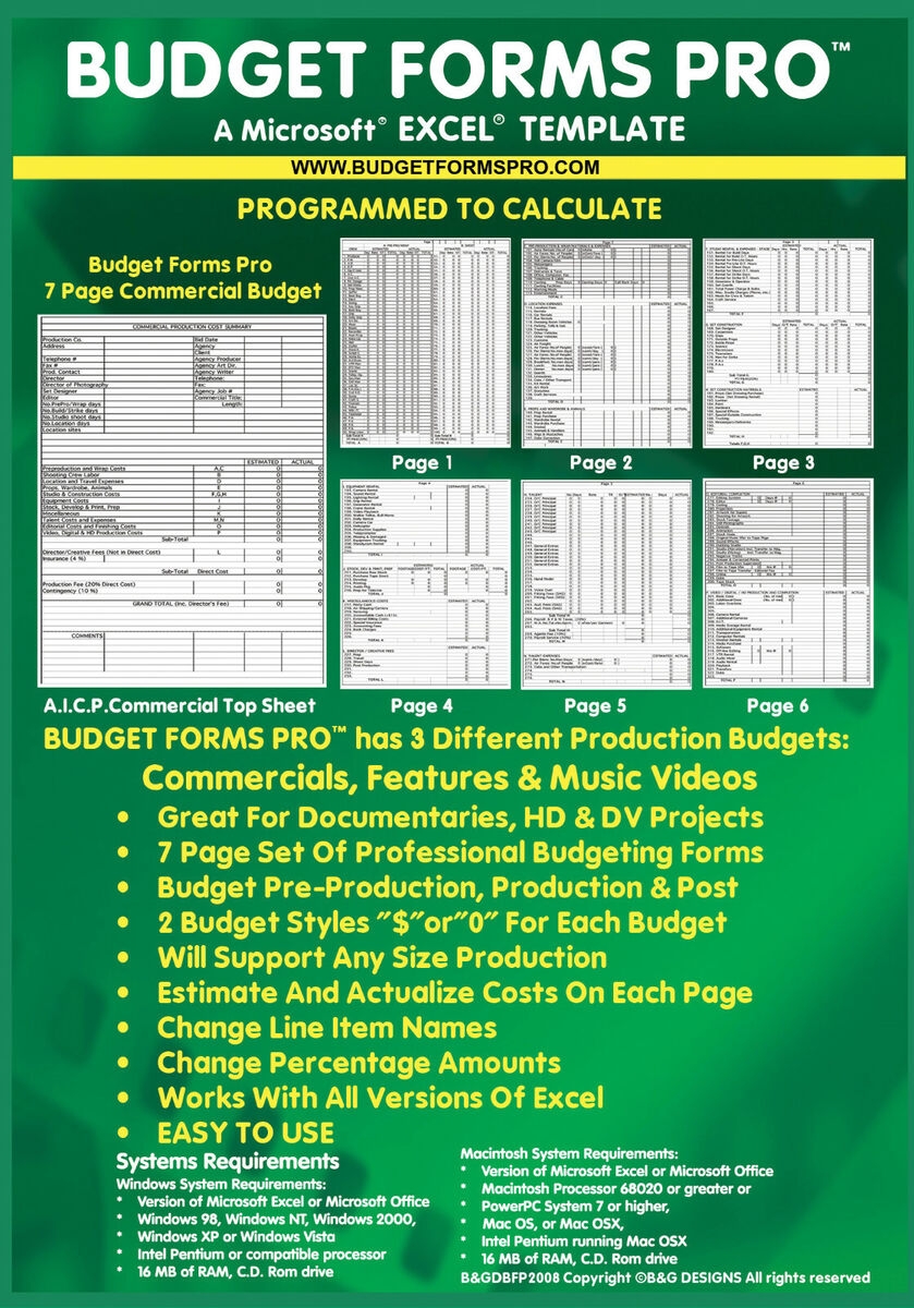 Film Digital AICP Music Video Documentary Easy Use Budget Forms Excel FS
