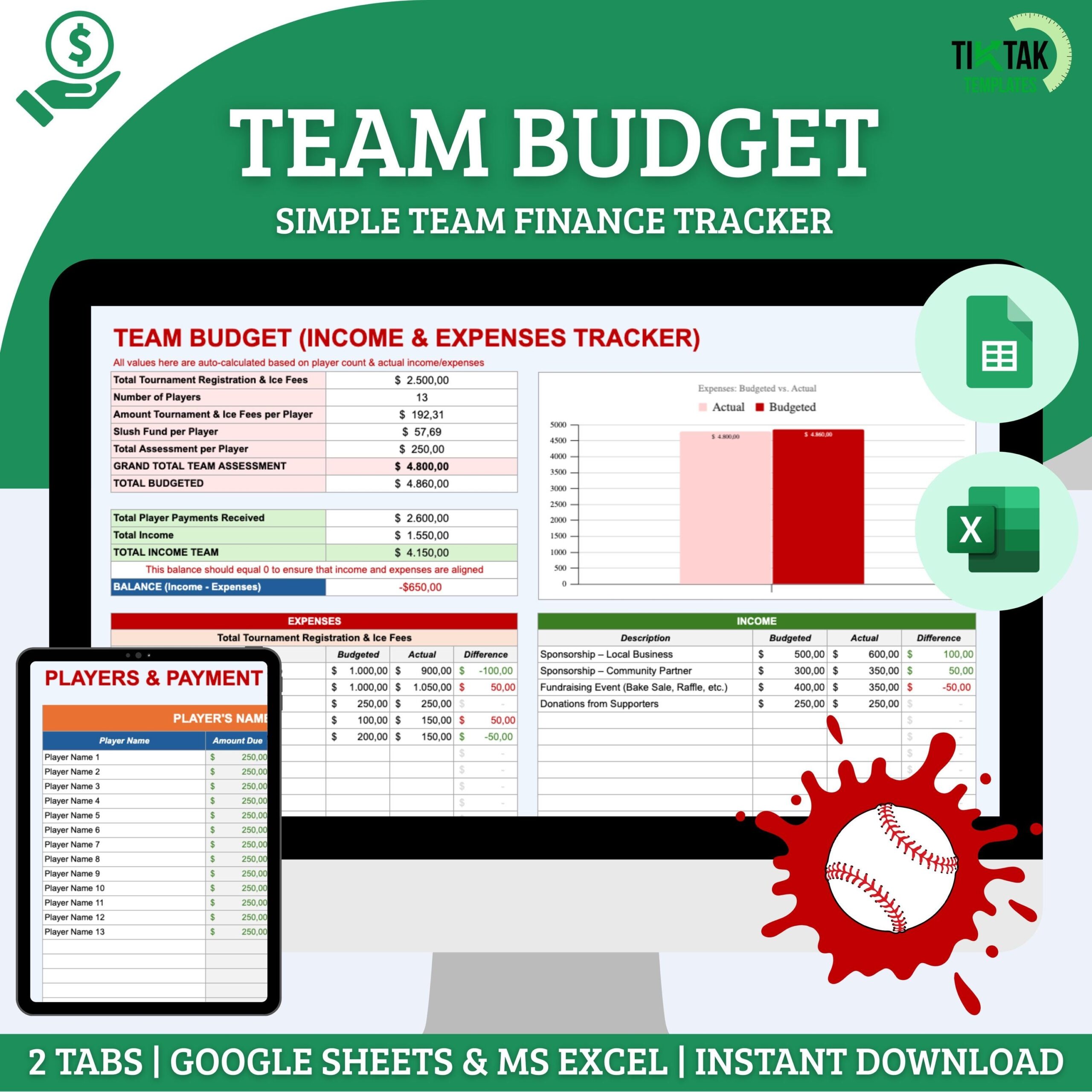 Travel Baseball Team Budget Managing Expenses For Successful Season Excel Template And Google Sheets File For Free Download Slidesdocs