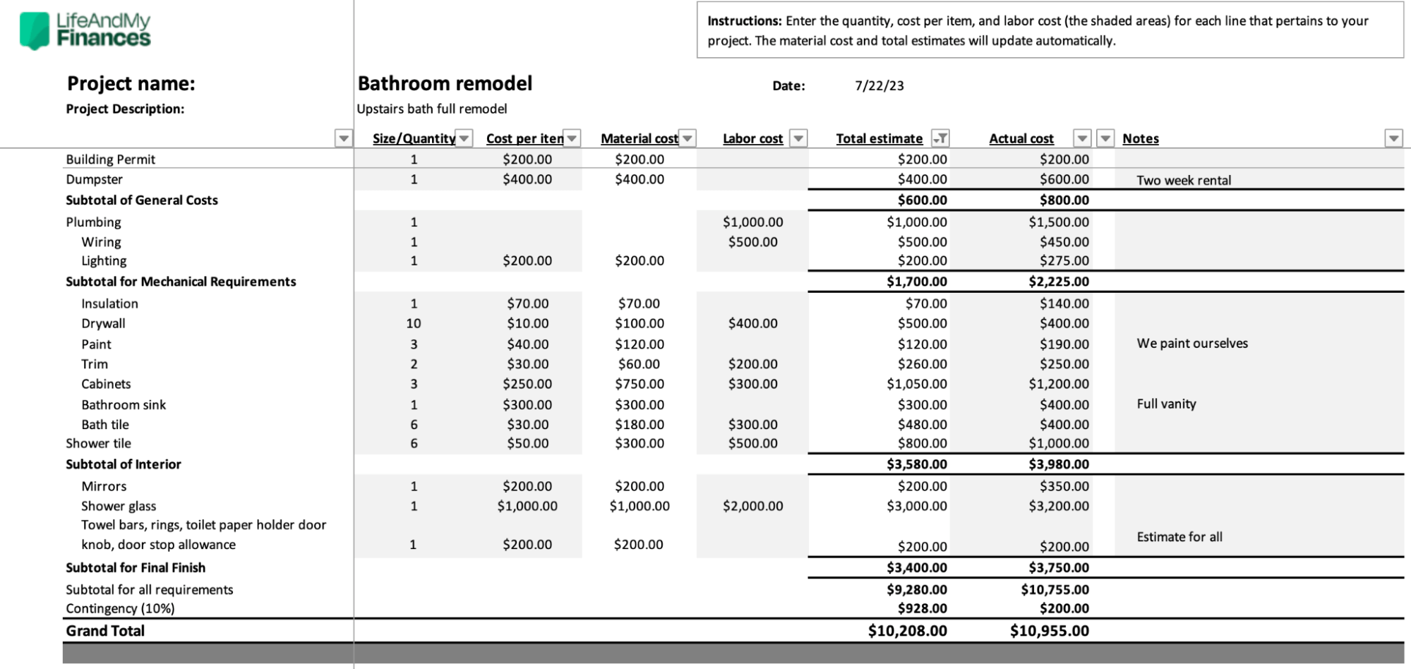 Bathroom Remodel Budget Template In Excel Google Sheets Download Template