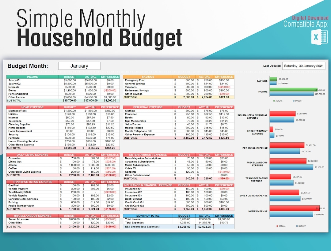 Monthly Household Budget Template Easy To Use Excel Spreadsheet Digital Download Etsy