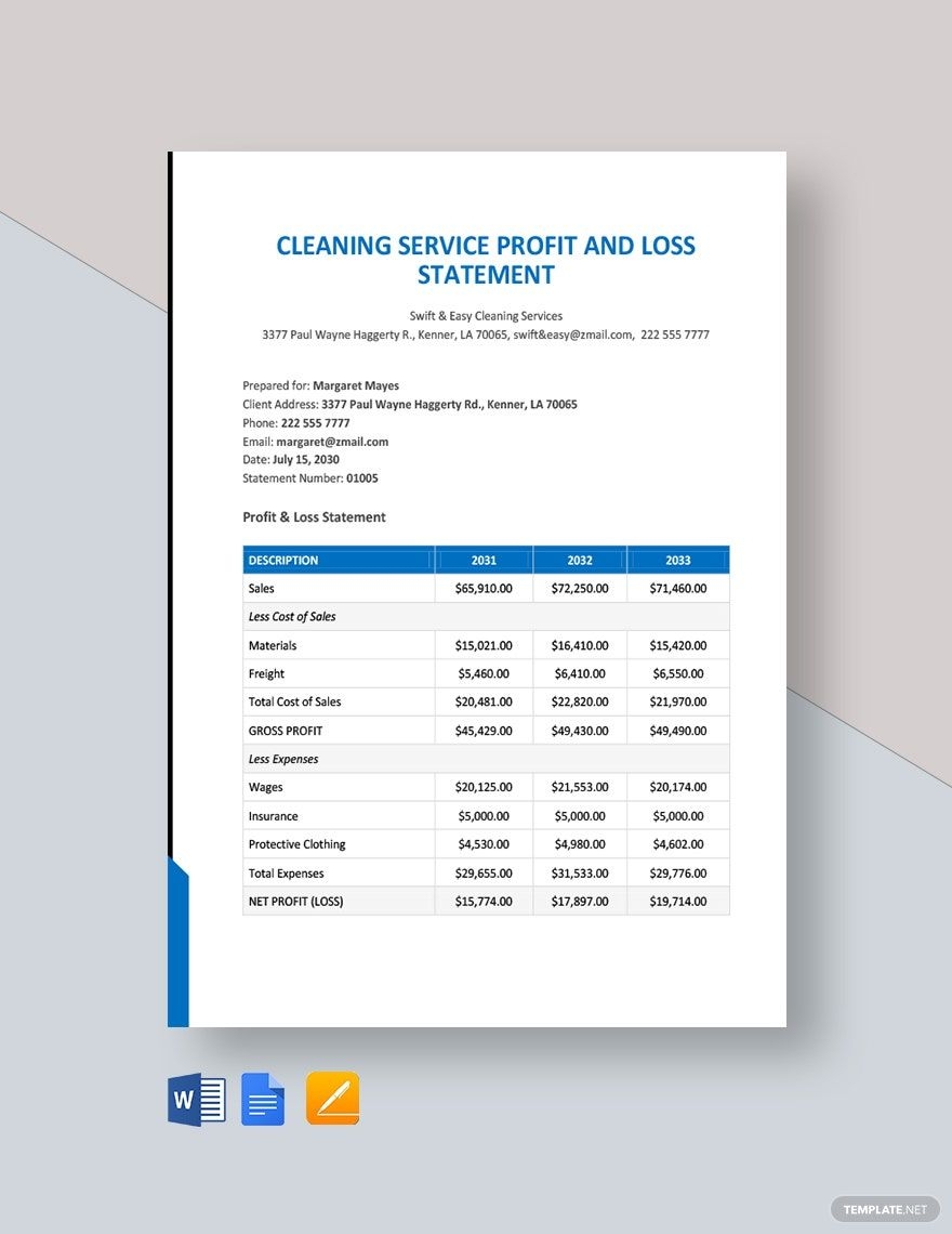 Cleaning Service Profit And Loss Statement Template In Word Google Docs Download Template
