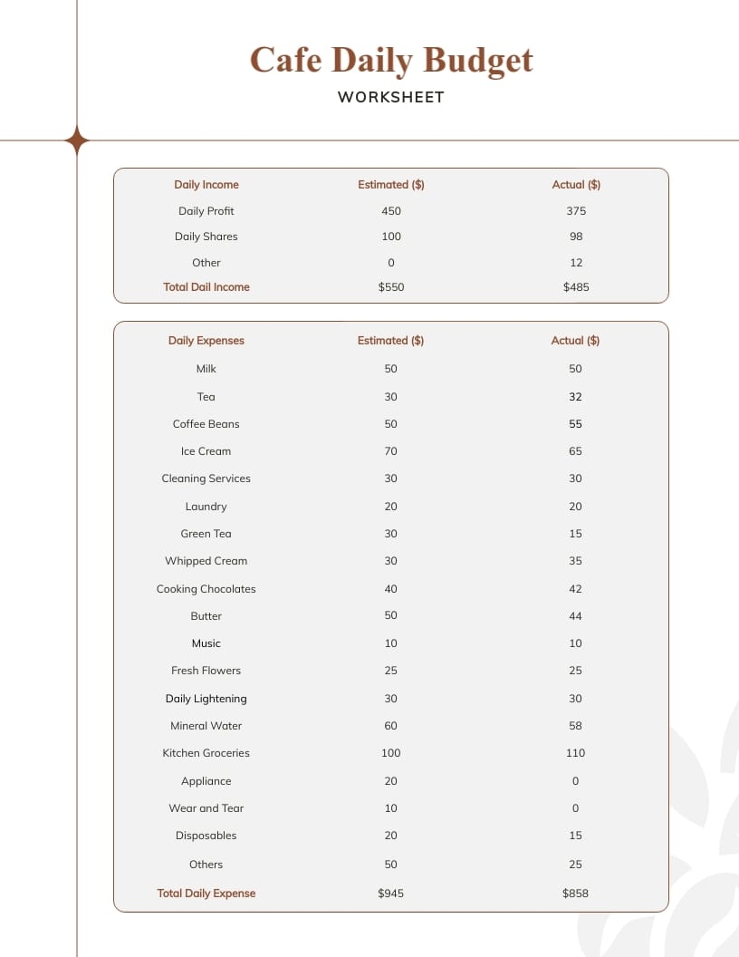 Cafe Daily Budget Worksheet Template Visme