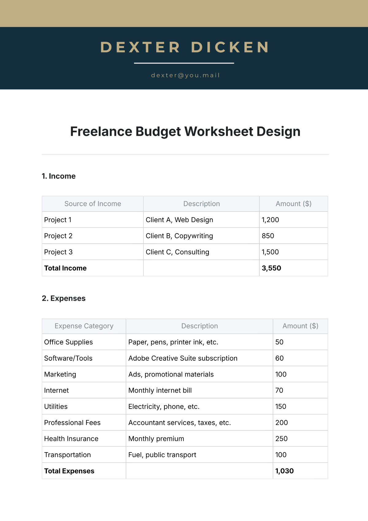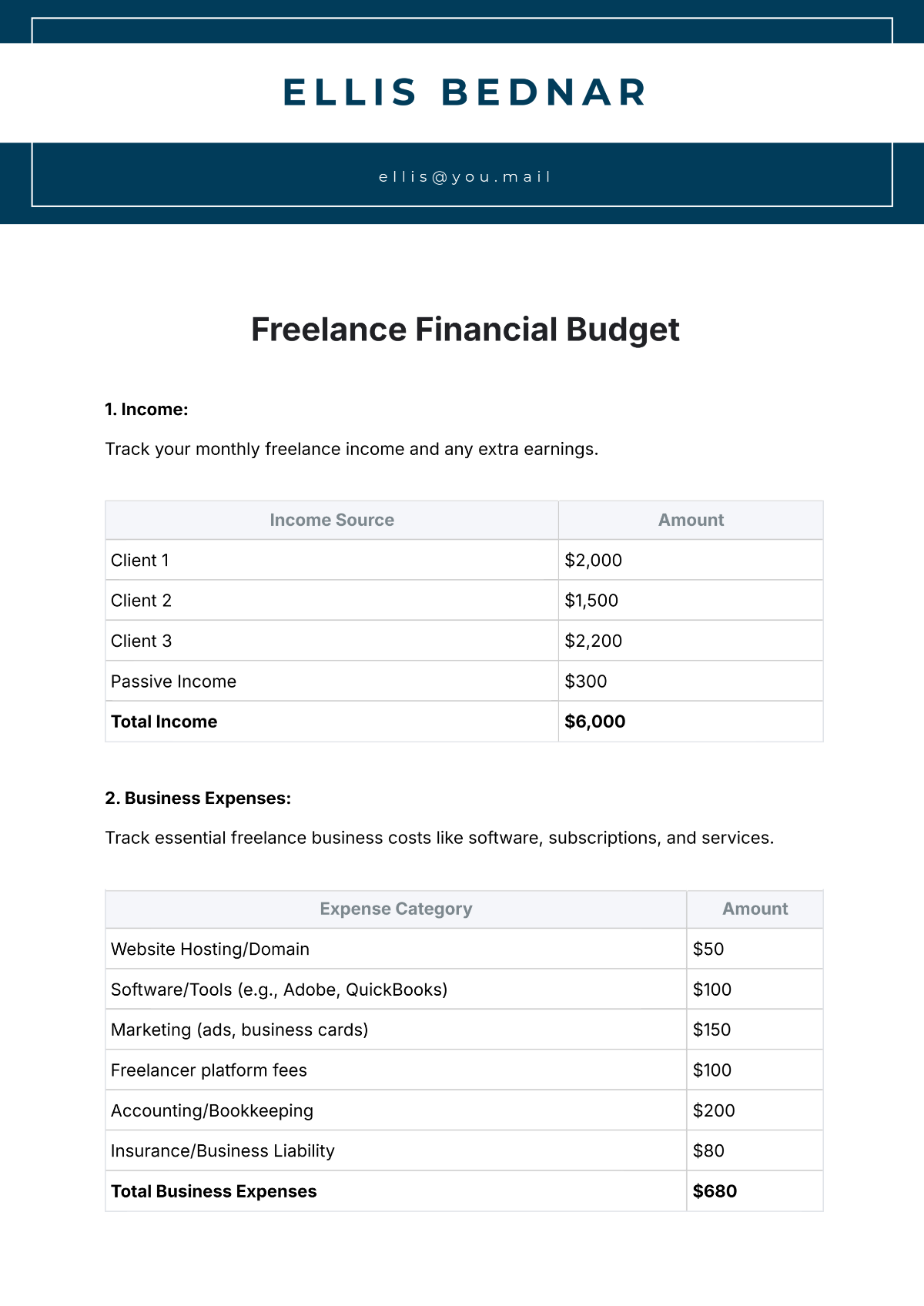 Creating a freelance budget template doesn’t have to be complicated. Start by listing all your sources of income, such as client payments, affiliate sales, or any other revenue streams you have. Next, track your monthly expenses, including rent, utilities, and business costs.