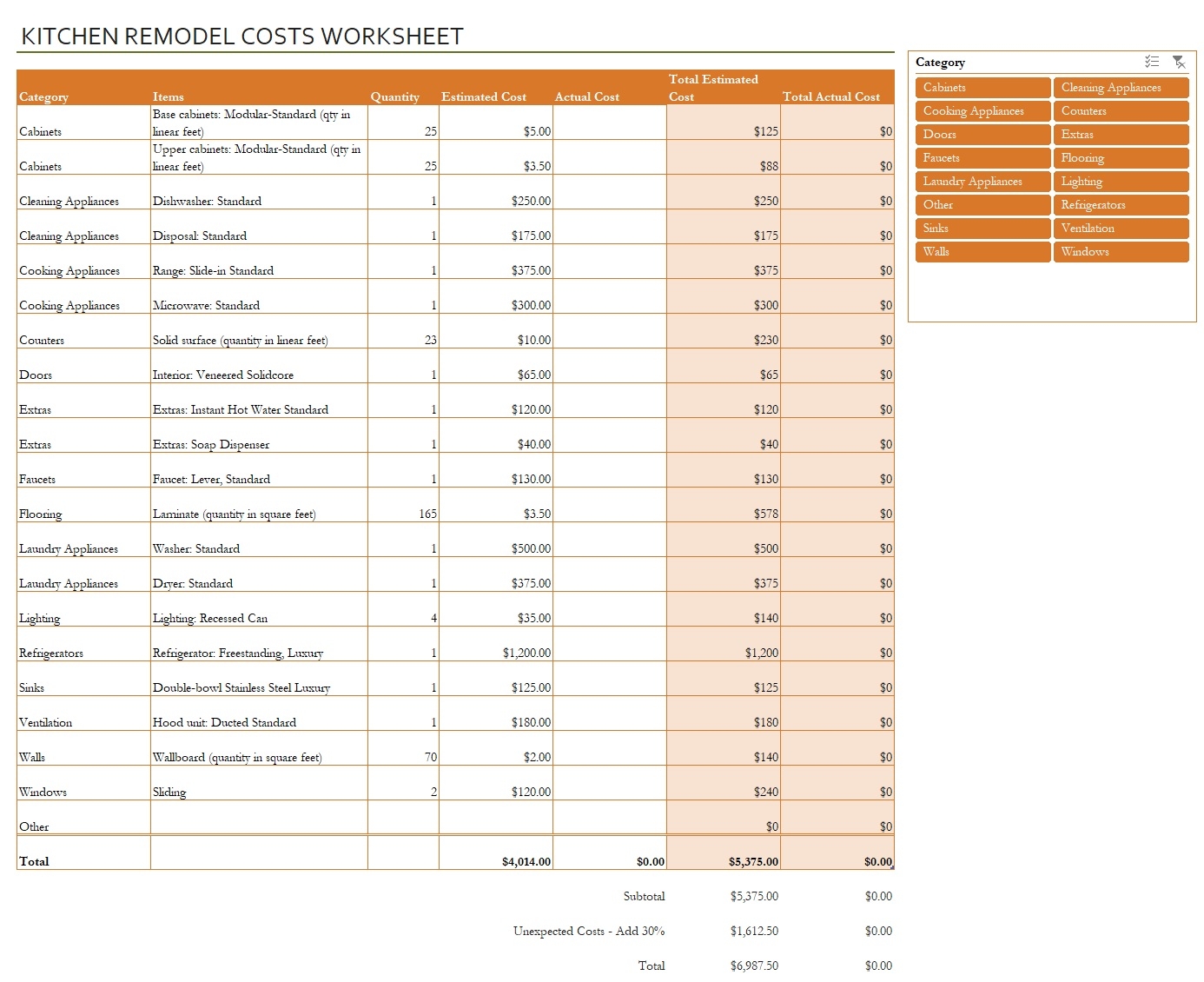 Kitchen Remodel Costs Calculator Excel Template Renovation Cost Vs Budget Tracker Etsy