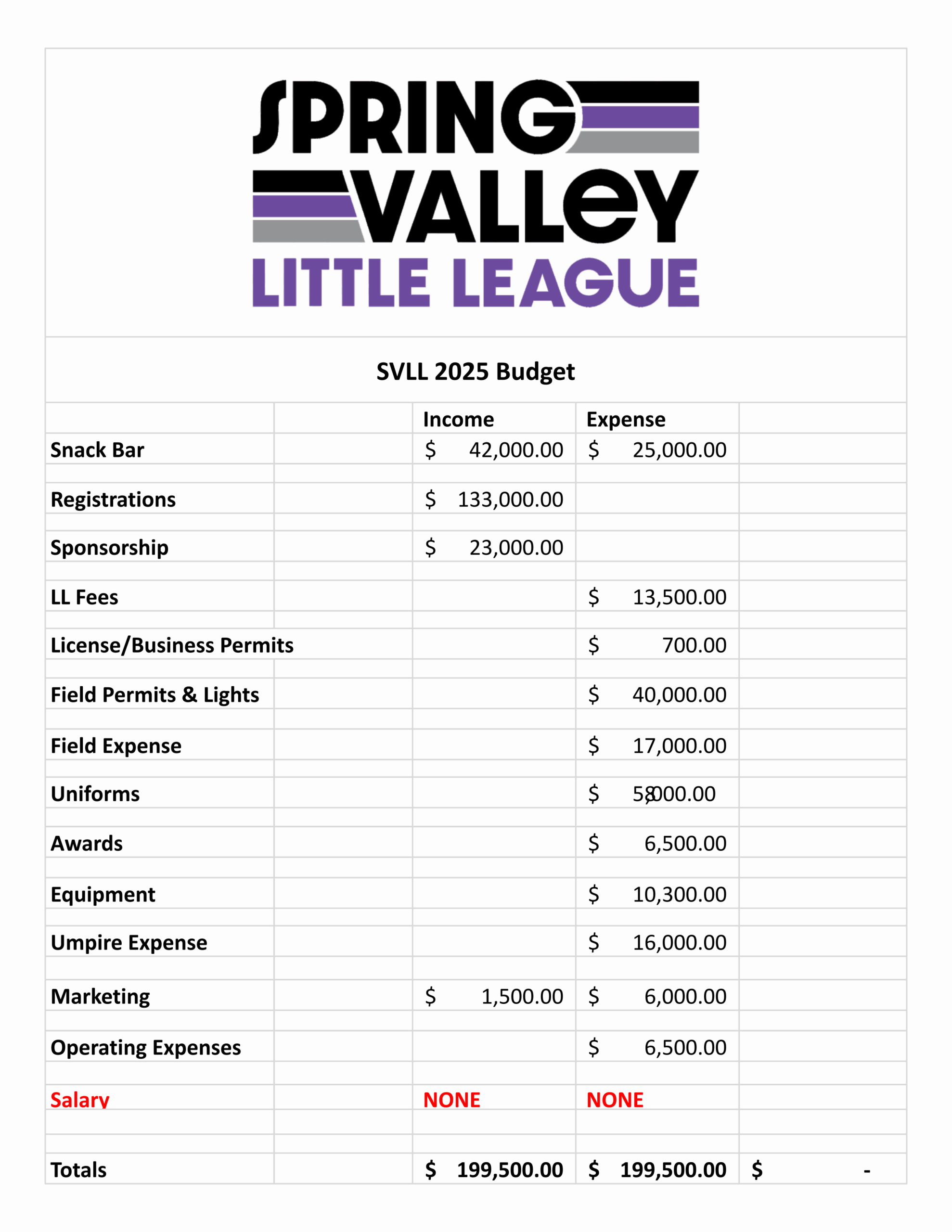 Little League Budget Template