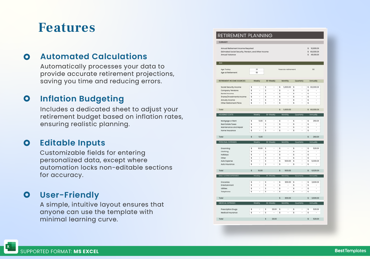 One of the key benefits of using a retirement budget spreadsheet template is that it helps you visualize your financial situation. You can see where your money is going and identify areas where you can cut back or save more.