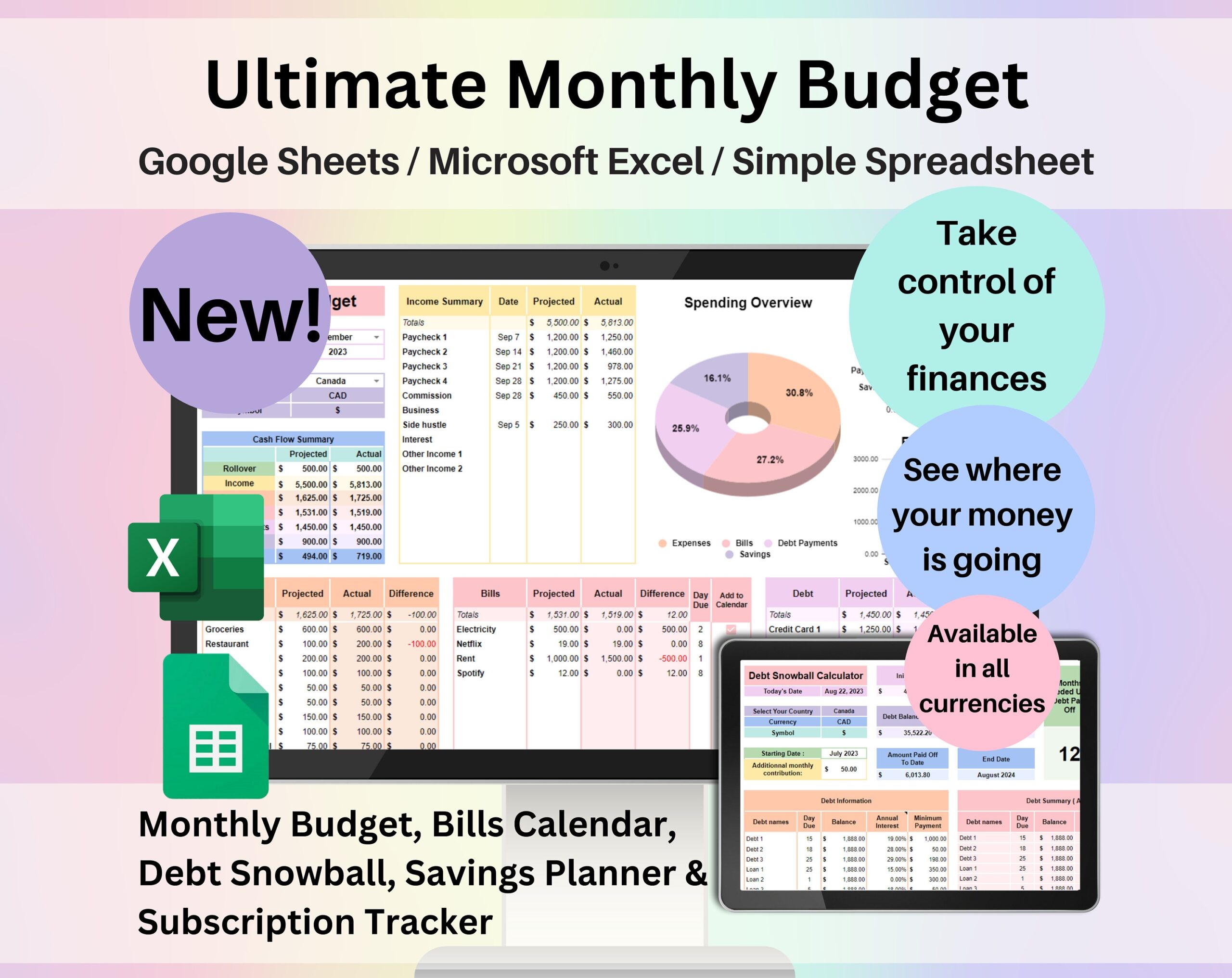 Ultimate Monthly Budget Spreadsheet Google Sheets Excel Template Digital Financial Planner Debt Snowball Sinking Fund Subscription Tracker Etsy